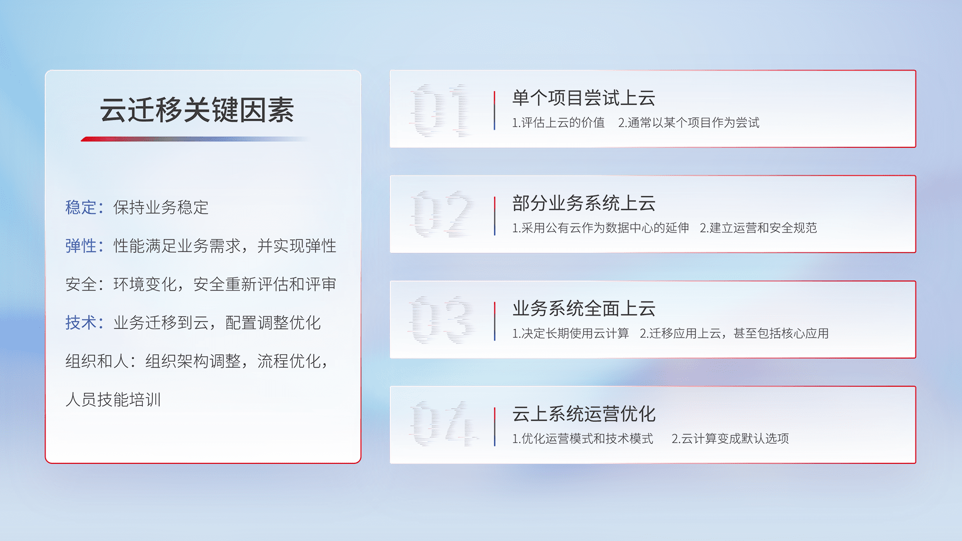 结合实际业务,,从规划设计、、云平台选型、、、云原生改造、、数据迁移、、、集成交付,,迁移全过程为客户识别最佳上云路径,,,做好风险识别管理,,,设计网络架构、、身份权限、、安全审计合规、、操作审计、、日志审计、、、、监控告警策略、、多站点容灾设计等,,,对云上基础设施进行整体规划,,,提升IT治理水平,,以满足弹性、、高可用、、、、高性能的需求。。