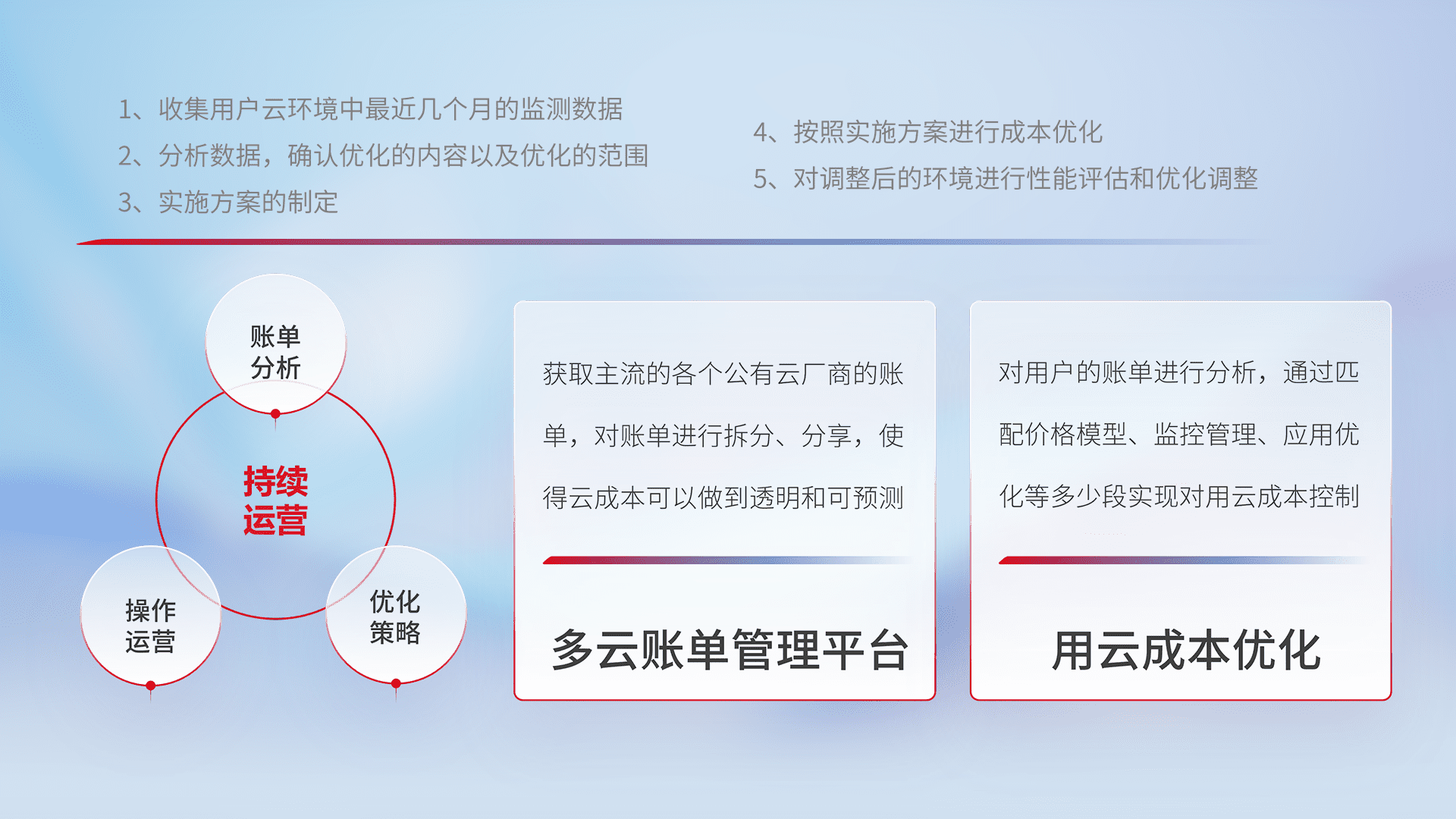 通过多云纳管,,,以统一的资源数据模型把客户的云资源进行抽象和封装,,,进而实现对多云资源的统一操作,,,保障云资源管理的可靠性、、稳定性与可用性。。。。量身定制化运维内容,,配置、、、开发运维、、、、补丁管理、、、、备份、、监控、、、认证和访问管理、、、审计和日常巡检等,,保障在用云过程中的可靠度,,,稳定度以及高可用率。。。。