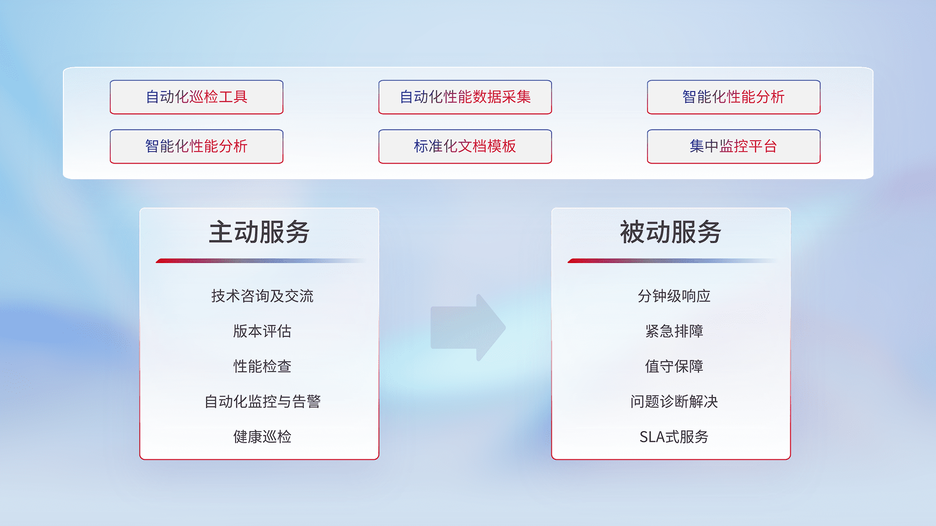 智能化工具和标准化文档,,,,保障服务质量,,,提供主动服务(包含技术咨询、、、、版本评估、、、、性能检查、、自动化监控与告警、、健康巡检)和被动服务包含(分钟级响应、、、、紧急排障、、、值守保障、、、问题诊断解决、、、、SLA服务)。。